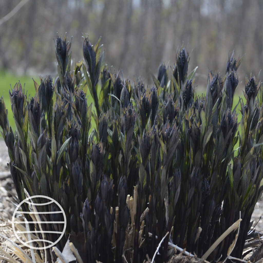 New stems emerge close to black in colour, light green leaves with a silver sheen form the backdrop light blue, star shaped flowers