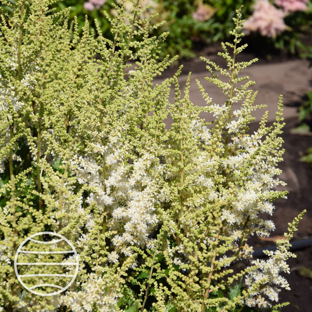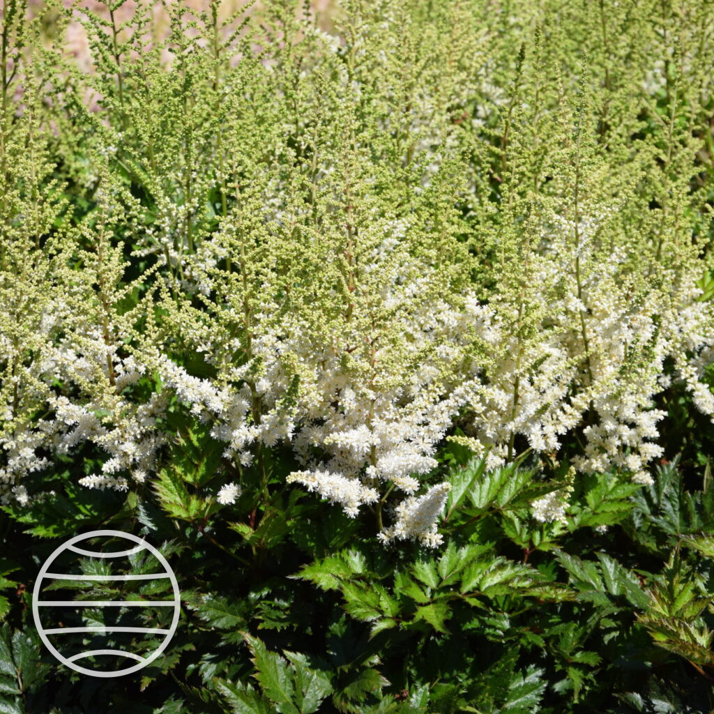 Astilbe Visions selections, based on Astilbe chinensis, gives the varieties strong flowering and excellent garden performances. In White Delight has bright white plumes with green tips.